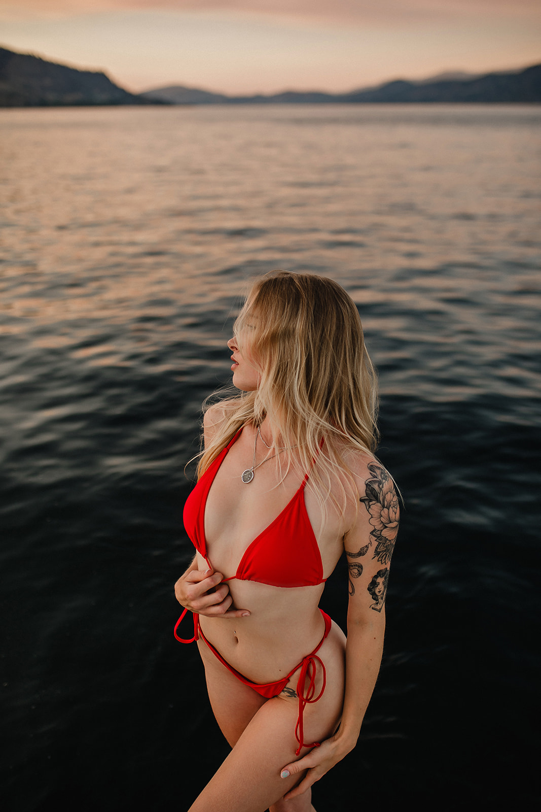 As the sun dipped below the horizon, Lexy took over. With her keen eye for detail, she documented Mimi in the fleeting moments of twilight. The soft, fading light over the lake and Mimi’s serene presence created a series of images that are both captivating and poetic.