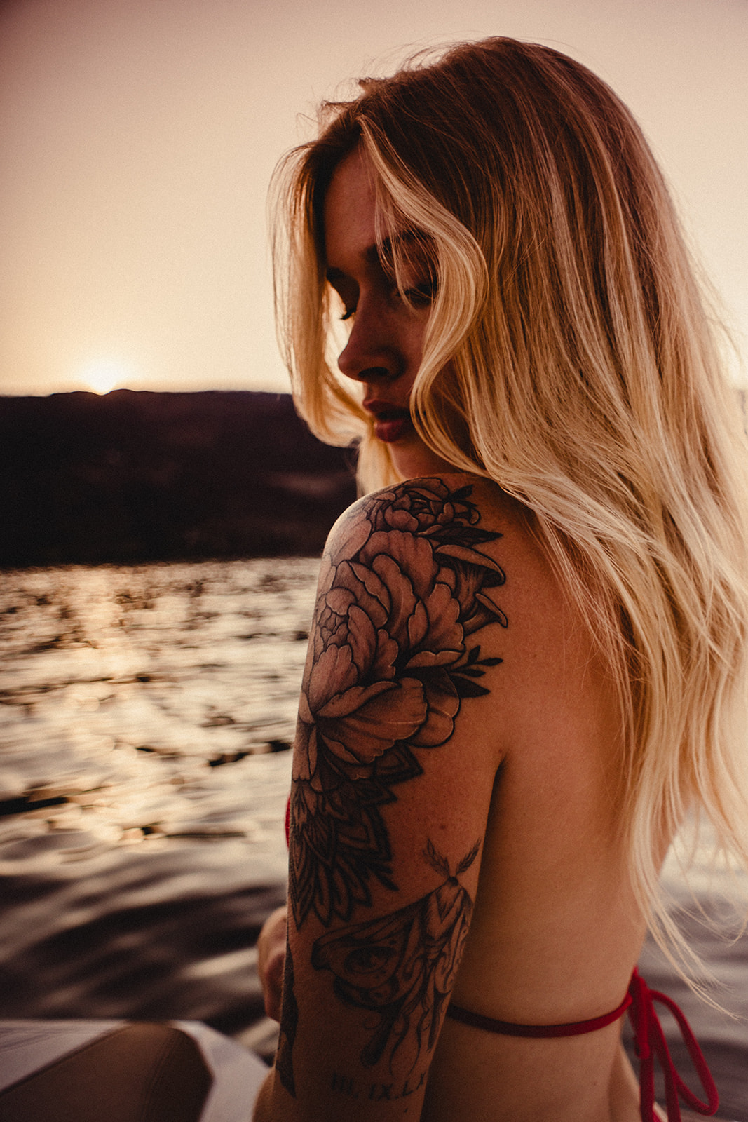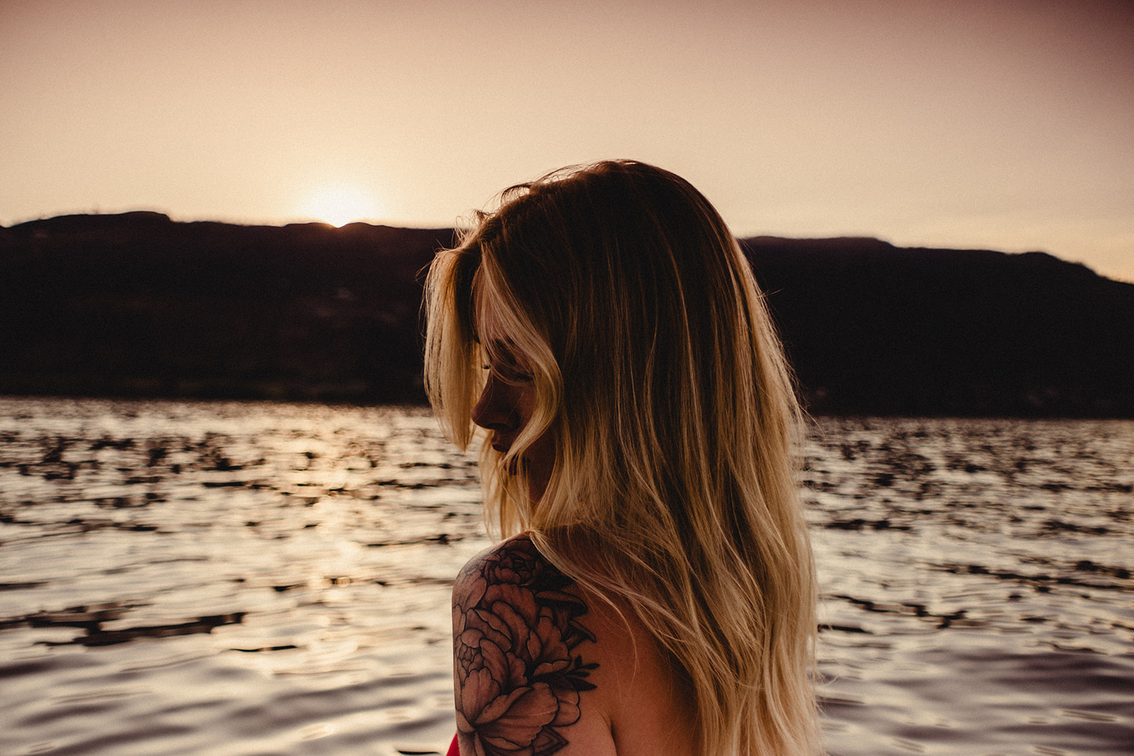 The evening began with the sun low on the hills, casting a warm, golden glow on Mimi and the water. Clay, armed with his camera and vintage lenses, seized the moment to capture stunning sunflares. The interplay of light and lens created an ethereal atmosphere, making Mimi’s beauty and the surrounding scenery look like a dream.